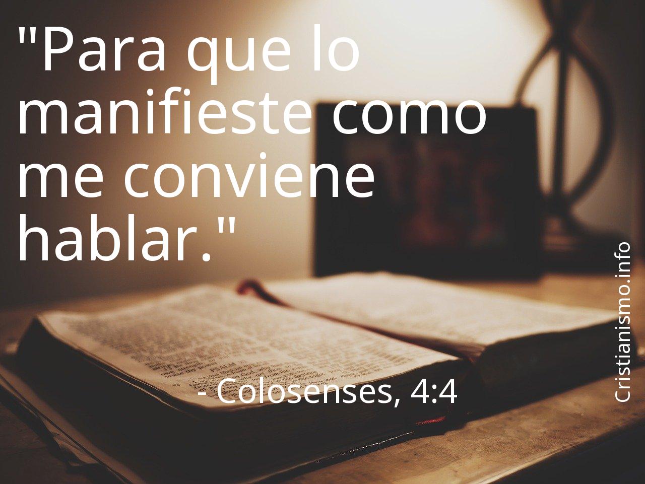 El versiculo Colosenses, 4:4 de los Textos Sagrados que componen la Biblia es algo que es preciso tomar en todo momento en cuenta para reflexionar acerca de él. ¿Qué intentaba decirnos Dios Padre con el versículo Colosenses, 4:4? ¿En qué momentos de nuestra vida diaria tenemos la oportunidad de hacer valer lo que hemos aprendido gracias al versículo Colosenses, 4:4 de La Sagrada Biblia?