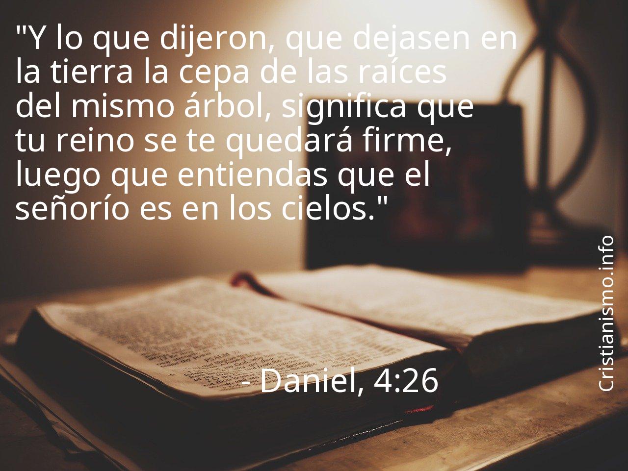 El versiculo Daniel, 4:26 de los Textos Sagrados que componen la Biblia consiste en algo que deberíamos tener continuamente presente con el objetivo de hacer una reflexión en torno a él. Acaso deberíamos hacernos la pregunta ¿Qué quiso decirnos Dios con el versículo Daniel, 4:26? ¿Cuáles son los momentos de nuestra vida diaria en que seremos capaces de aprovechar aquello que hemos alcanzado a saber gracias al versículo Daniel, 4:26 de Las Sagradas Escrituras?