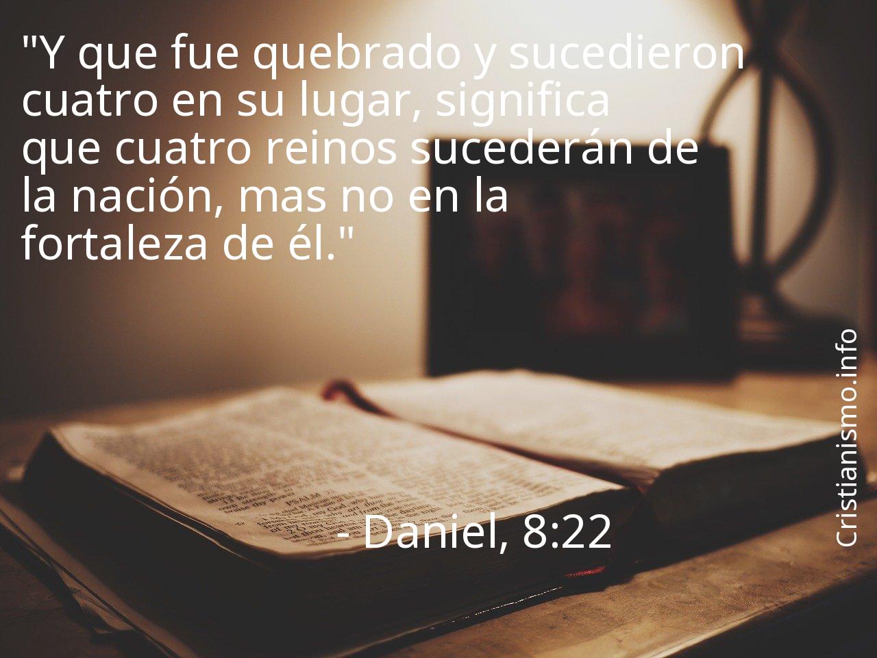 Es aconsejable tener en todo momento presente el versículo Daniel, 8:22 de La Sagrada Biblia para meditar sobre él.Probablemente sería bueno preguntarse ¿Qué intentaba manifestarnos Nuestro Padre que está en los Cielos con el versículo Daniel, 8:22? ¿Cuáles serán las coyunturas de nuestra vida diaria en que seremos capaces de llevar a la práctica lo que hemos aprendido gracias al versículo Daniel, 8:22 de la Santa Biblia?