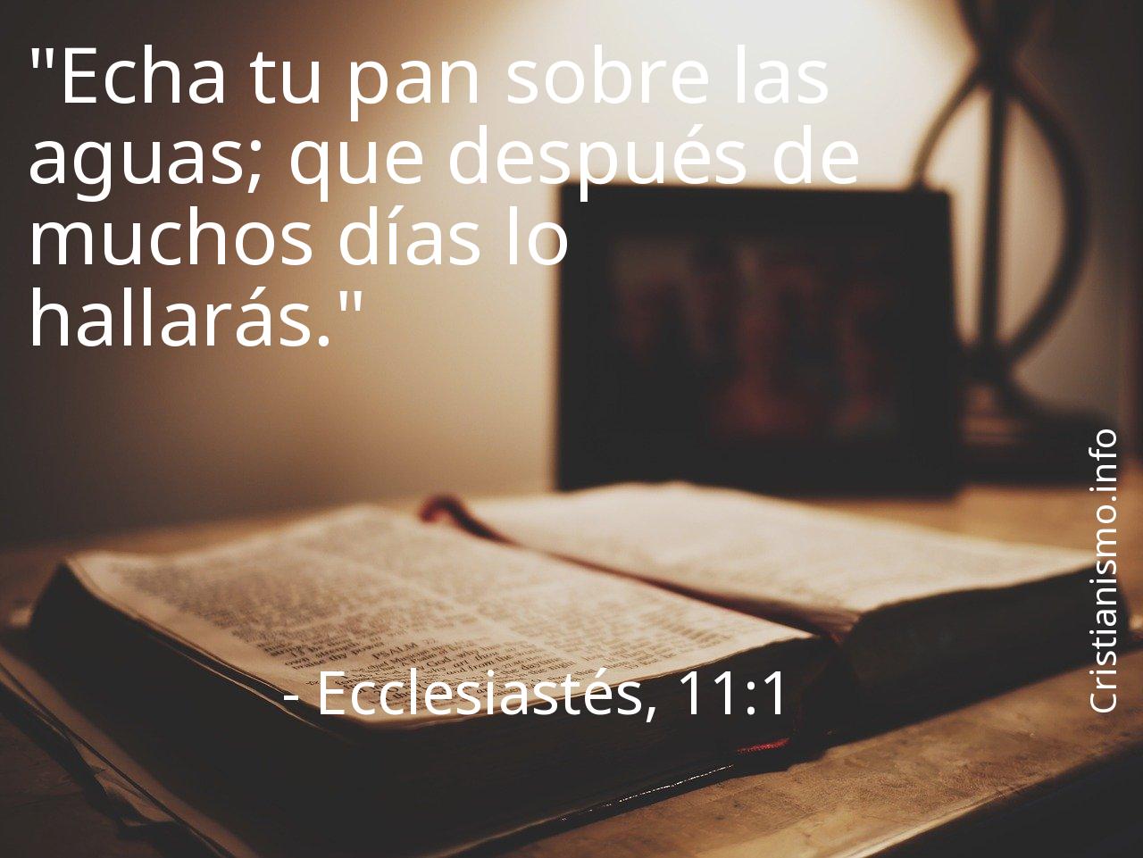 Es muy recomendable tener en todo momento presente el versículo Eclesiastés, 11:1 de La Santa Biblia a fin de analizarlo y pensar en torno a él.Quizás deberíamos hacernos la pregunta ¿Qué pretendía decirnos Dios, Creador del Cielo y de la Tierra con el versículo Eclesiastés, 11:1? ¿Cuáles serán las coyunturas de nuestra vida diaria en que podemos llevar a la práctica aquello que aprendemos gracias al versículo Eclesiastés, 11:1 de Las Sagradas Escrituras?