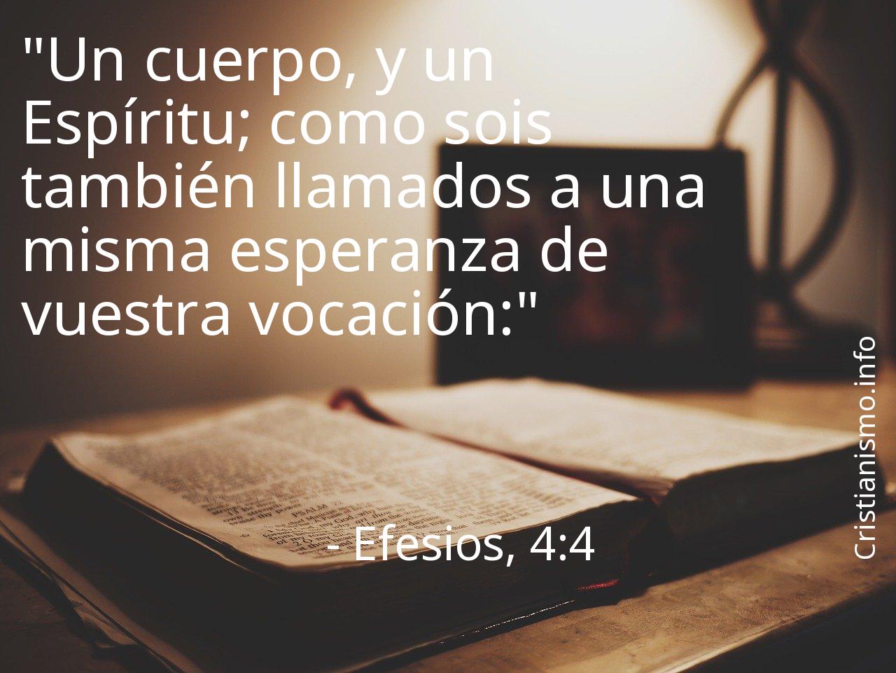 El versiculo Efesios, 4:4 de los Textos Sagrados que componen la Biblia es algo que es muy recomendable tomar siempre en consideración con el objetivo de analizarlo y pensar en torno a él. ¿Qué trataba de proponernos Dios con el versículo Efesios, 4:4? ¿Cuáles serán las coyunturas de nuestra vida cotidiana en que podemos recurrir a aquello que hemos llegado a saber gracias al versículo Efesios, 4:4 de La Sagrada Biblia?