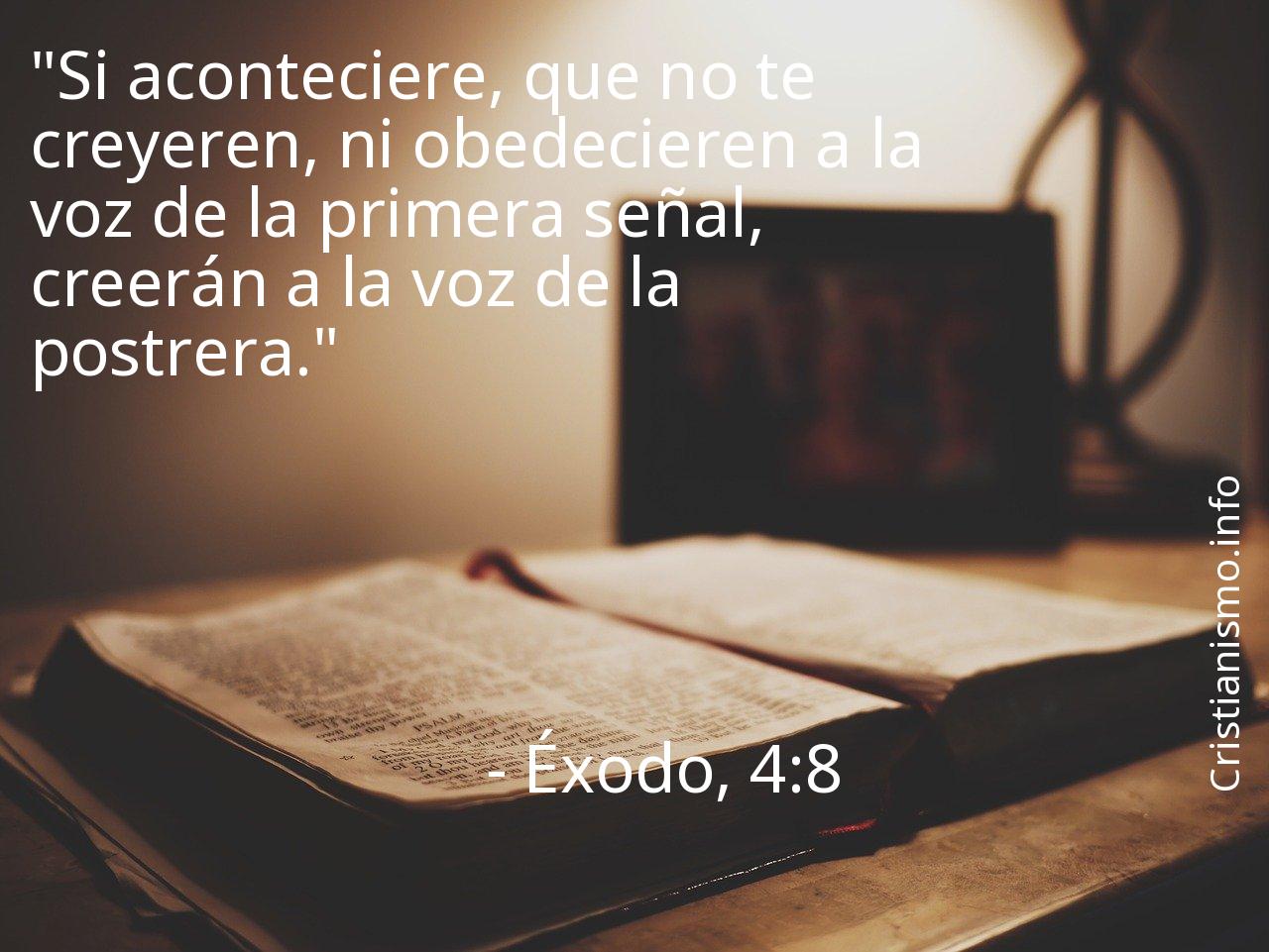 Dedicar tiempo a la meditación en relación con el versículo Éxodo, 4:8 nos supone una ayuda a ser más agradables a los ojos de el Creador del Cielo y de la Tierra y a acercarnos más a Dios, por ese motivo es útil servirse del versículo Éxodo, 4:8 en todas aquellas ocasiones en que nos pueda servir de guía y así saber cómo proceder o para traer la serenidad a nuestras almas.