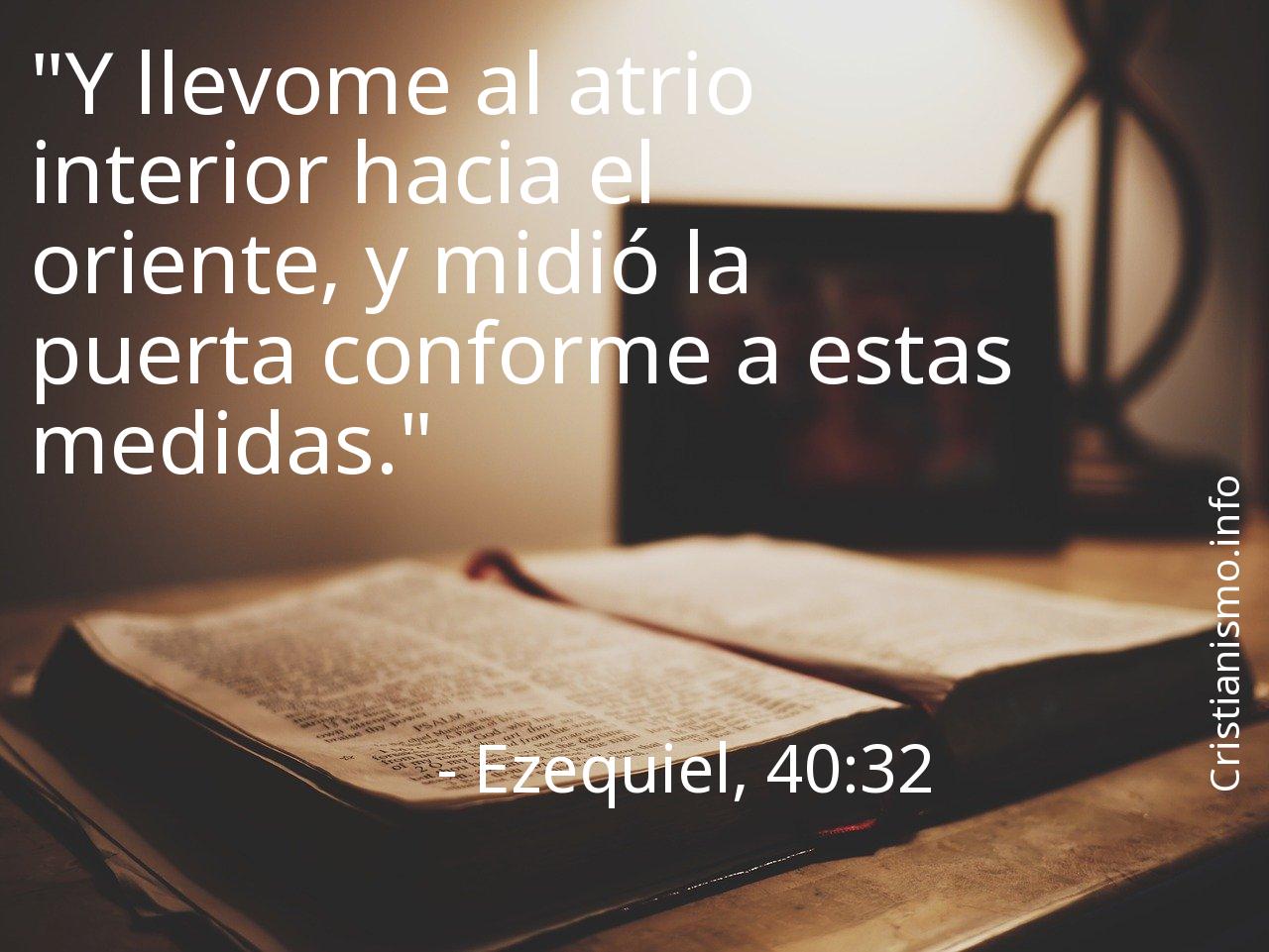 El versiculo Ezequiel, 40:32 de La Santa Biblia es algo que hay que tomar continuamente en consideración con el fin de meditar acerca de él.Seguramente sería acertado cuestionarse ¿Qué intentaba decirnos Dios, Creador del Cielo y de la Tierra con el versículo Ezequiel, 40:32? ¿Cuáles serán las coyunturas de nuestra vida diaria en que podemos recurrir a aquello que hemos aprendido gracias al versículo Ezequiel, 40:32 de la Santa Biblia?