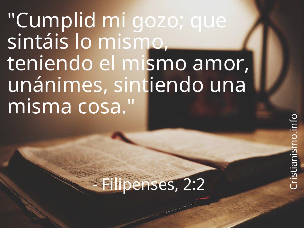 Hacer un análisis profundo sobre el versículo Filipenses, 2:2 es un gran aporte que nos permite a ser mejores cristianos y a avanzar en nuestro camino hacia la Gracia de Dios, por ese motivo es conveniente apoyarse en el versículo Filipenses, 2:2 siempre que necesitemos una luz que nos guíe y así saber cómo actuar o para traer la paz a nuestras almas.