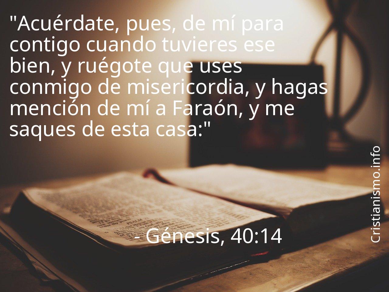 Discurrir y recapacitar sobre el versículo Génesis, 40:14 nos ayuda a ser mejores personas y a avanzar en nuestro camino hacia la Gracia de Dios, ese es el motivo por el cual es conveniente recurrir al versículo Génesis, 40:14 en todas aquellas ocasiones en que pueda servirnos de guía para saber en qué forma acturar o para traer el sosiego a nuestro espíritu.