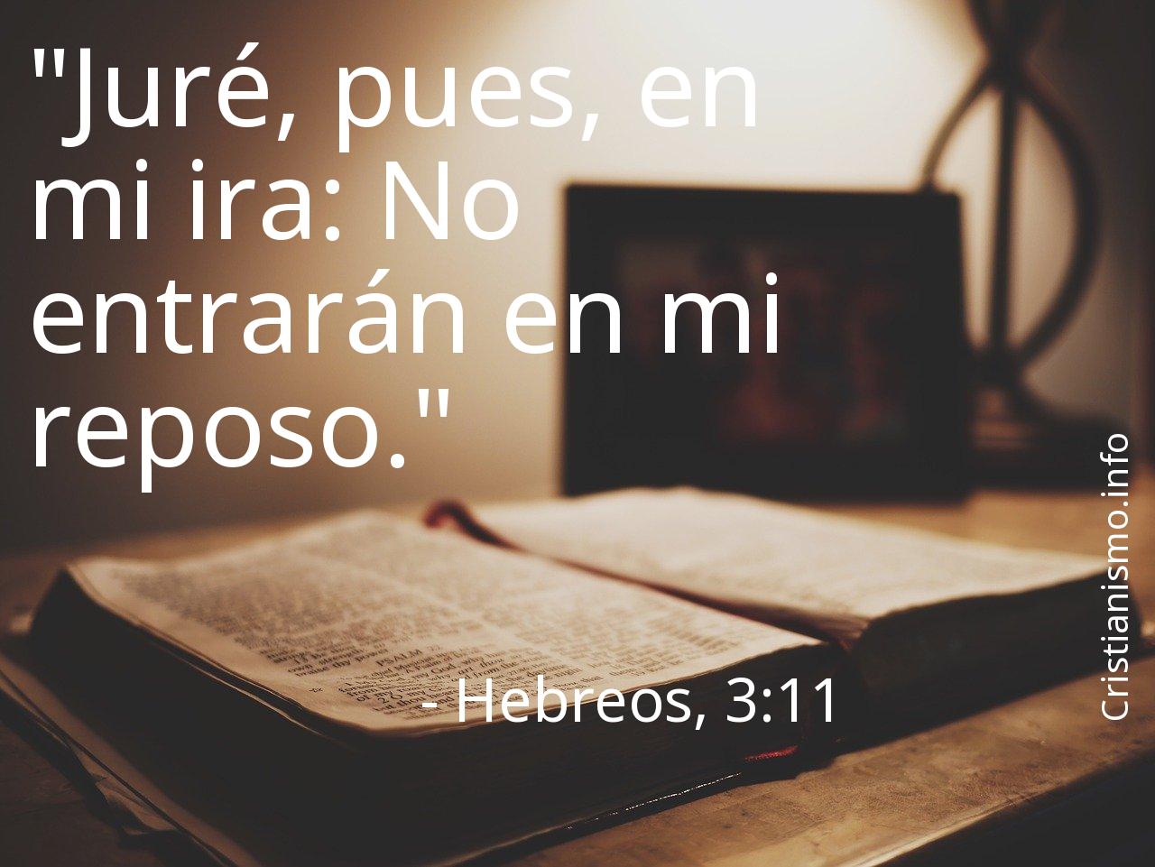 Es aconsejable tomar constantemente en consideración el versículo Hebreos, 3:11 de La Biblia con el propósito de reflexionar acerca de él.Tal vez sería bueno preguntarse ¿Qué intentaba manifestarnos Nuestro Padre Todopoderoso con el versículo Hebreos, 3:11? ¿Cuáles serán las coyunturas de nuestra vida diaria en que seremos capaces de llevar a la práctica lo que hemos alcanzado a saber gracias al versículo Hebreos, 3:11 de la Santa Biblia?