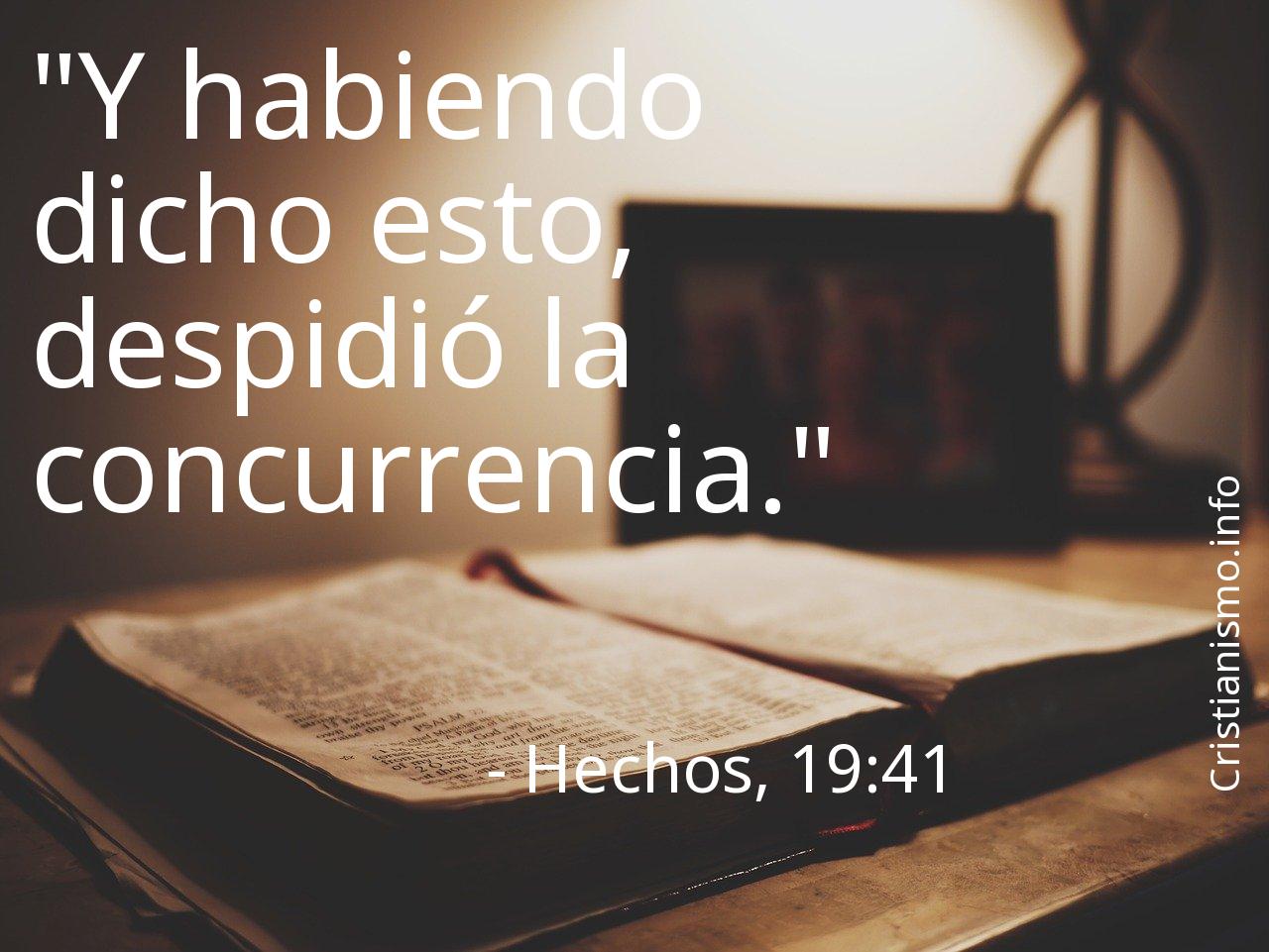 El hecho de reflexionar sobre el versículo Hechos, 19:41 nos resulta fundamental para llegar a a ser más agradables a los ojos de el Creador del Cielo y de la Tierra y a elevar nuestra alma hacia Dios, por eso es útil recurrir al versículo Hechos, 19:41 todas las veces que pueda servirnos de guía y así saber qué pasos dar o para traer el sosiego a nuestro espíritu.