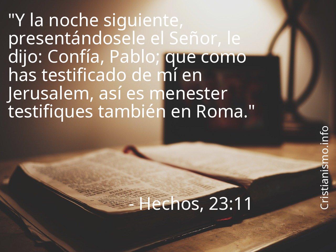 El versiculo Hechos, 23:11 de La Sagrada Biblia consiste en algo que es muy recomendable tener constantemente presente con la finalidad de hacer una reflexión sobre él.Probablemente deberíamos hacernos la pregunta ¿Qué quiso proponernos Nuestro Padre Todopoderoso con el versículo Hechos, 23:11? ¿Cuáles son los momentos de nuestra vida diaria en que podemos recurrir a lo que hemos alcanzado a saber gracias al versículo Hechos, 23:11 de La Biblia?