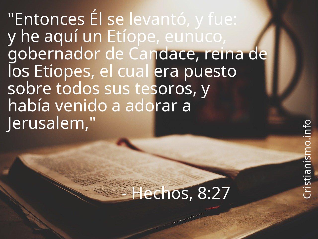 Debemos tomar en todo momento en cuenta el versículo Hechos, 8:27 de los Textos Sagrados que componen la Biblia con el propósito de meditar en torno a él.Probablemente deberíamos preguntarnos ¿Qué quiso manifestarnos el Señor con el versículo Hechos, 8:27? ¿Cuáles son los momentos de nuestra vida cotidiana en que seremos capaces de recurrir a lo que hemos aprendido gracias al versículo Hechos, 8:27 de Las Sagradas Escrituras?