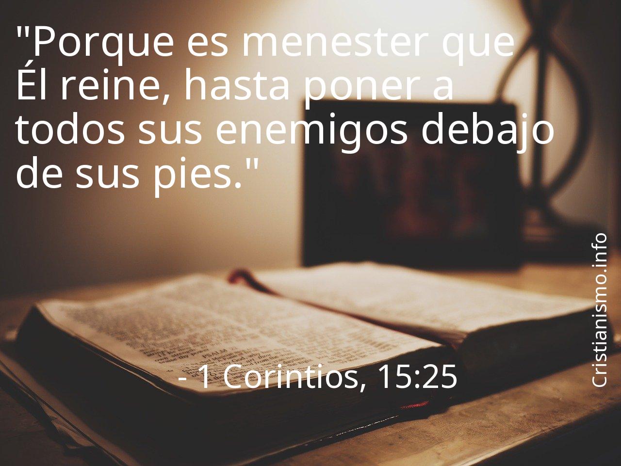 El versiculo 1 Corintios, 15:25 de los Textos Sagrados que componen la Biblia es algo que debemos tener continuamente presente con la finalidad de reflexionar sobre él.Probablemente sería bueno preguntarse ¿Qué pretendía proponernos Nuestro Padre Todopoderoso con el versículo 1 Corintios, 15:25? ¿Cuáles son las ocasiones de nuestro día a día en que tenemos la oportunidad de hacer valer aquello que hemos aprendido gracias al versículo 1 Corintios, 15:25 de Las Sagradas Escrituras?