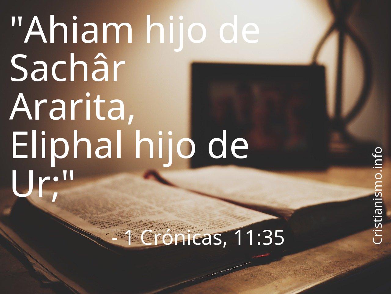 Hay que tomar en todo momento en cuenta el versículo 1 Crónicas, 11:35 de los Textos Sagrados que componen la Biblia de manera que podamos meditar en torno a él.Quizás deberíamos preguntarnos ¿Qué pretendía decirnos el Señor con el versículo 1 Crónicas, 11:35? ¿Cuáles son los momentos de nuestro día a día en que podemos poner en práctica aquello que hemos llegado a saber gracias al versículo 1 Crónicas, 11:35 de La Sagrada Biblia?