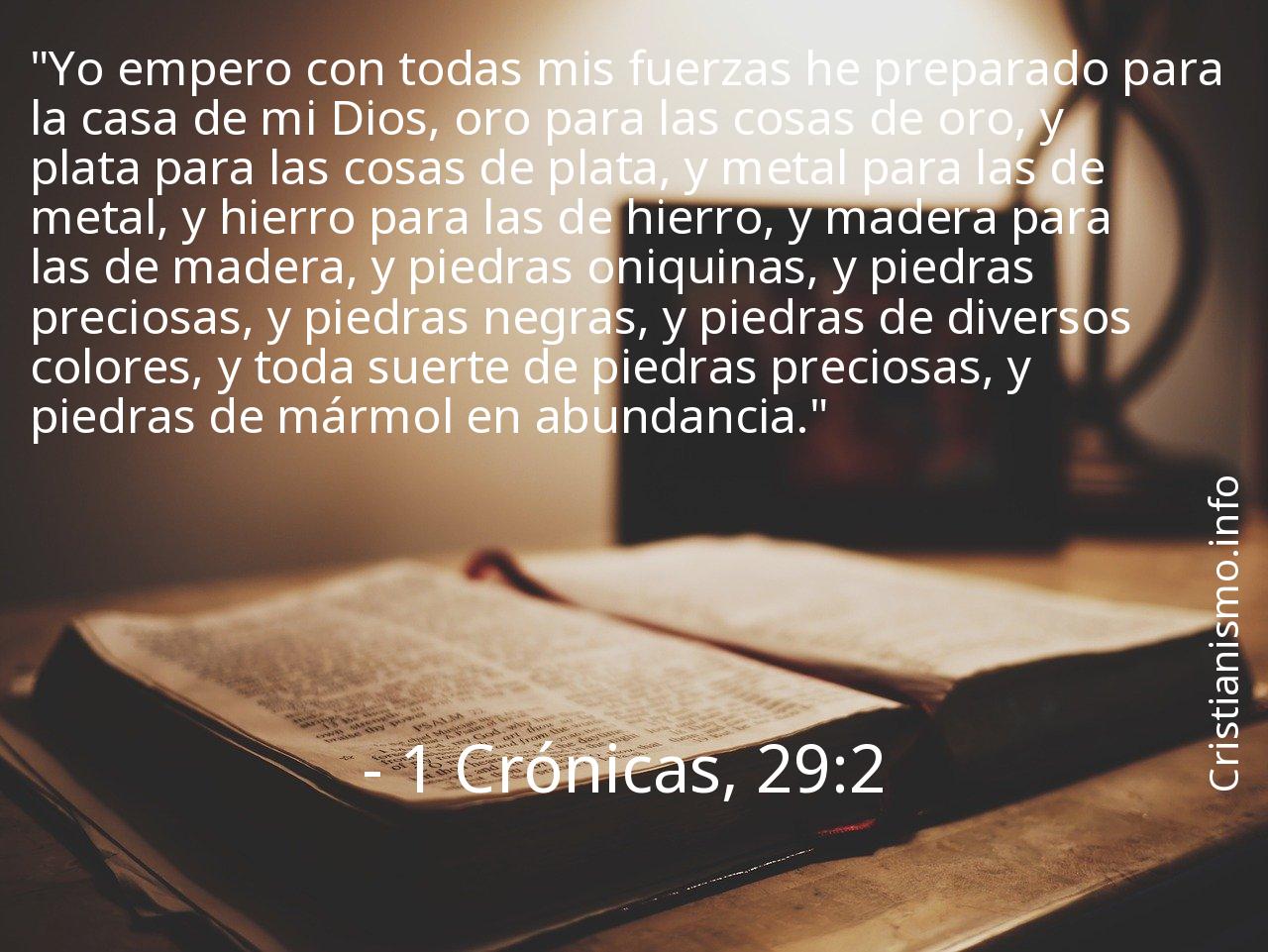 El hecho de reflexionar acerca de el versículo 1 Crónicas, 29:2 nos supone una ayuda a ser mejores personas y a aproximarnos más a Dios, por ese motivo es oportuno apoyarse en el versículo 1 Crónicas, 29:2 cada vez que nos pueda servir de guía de modo que podamos saber en qué forma acturar o para traer la paz a nuestras almas.