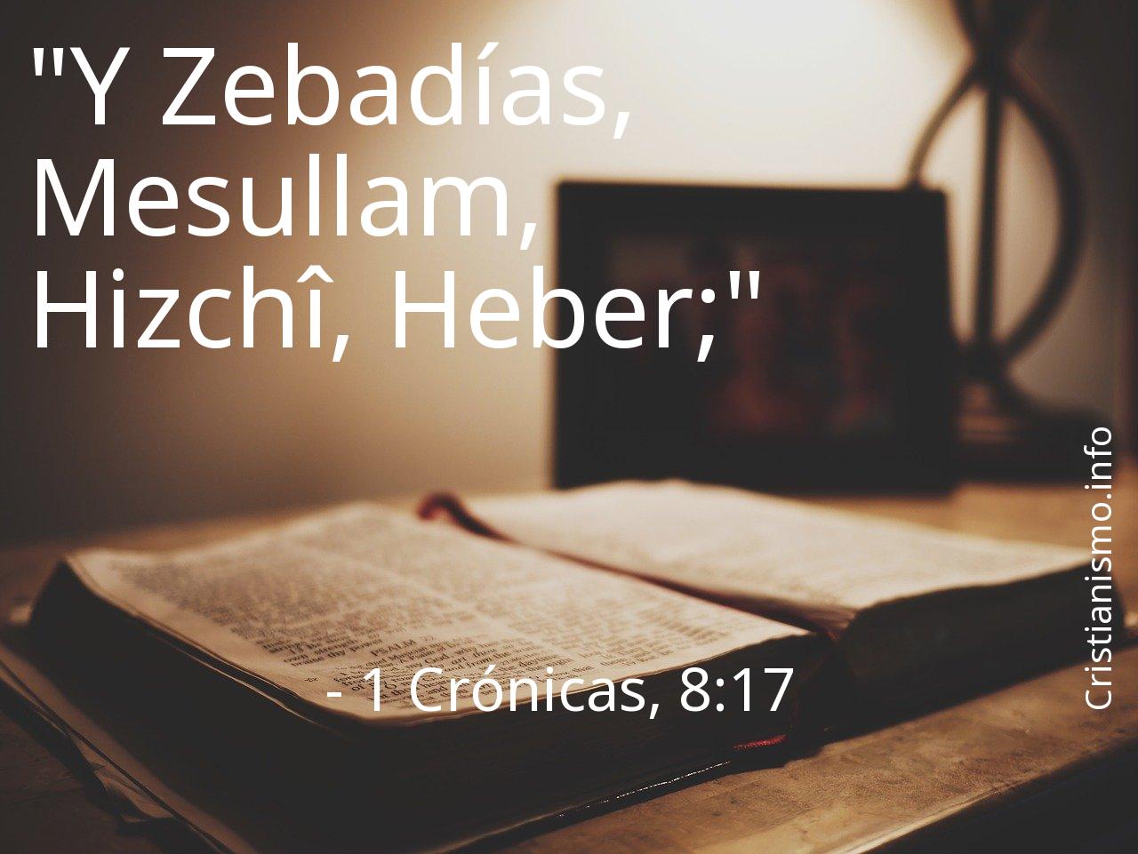 Dedicar tiempo a la meditación acerca de el versículo 1 Crónicas, 8:17 nos es de gran ayuda a ser capaces de acercarnos más al mensaje de Nuestro Señor y a acercarnos más a Dios, por ese motivo es útil servirse del versículo 1 Crónicas, 8:17 todas las veces que nos pueda servir de guía para saber cómo actuar o para traer la serenidad a nuestras almas.