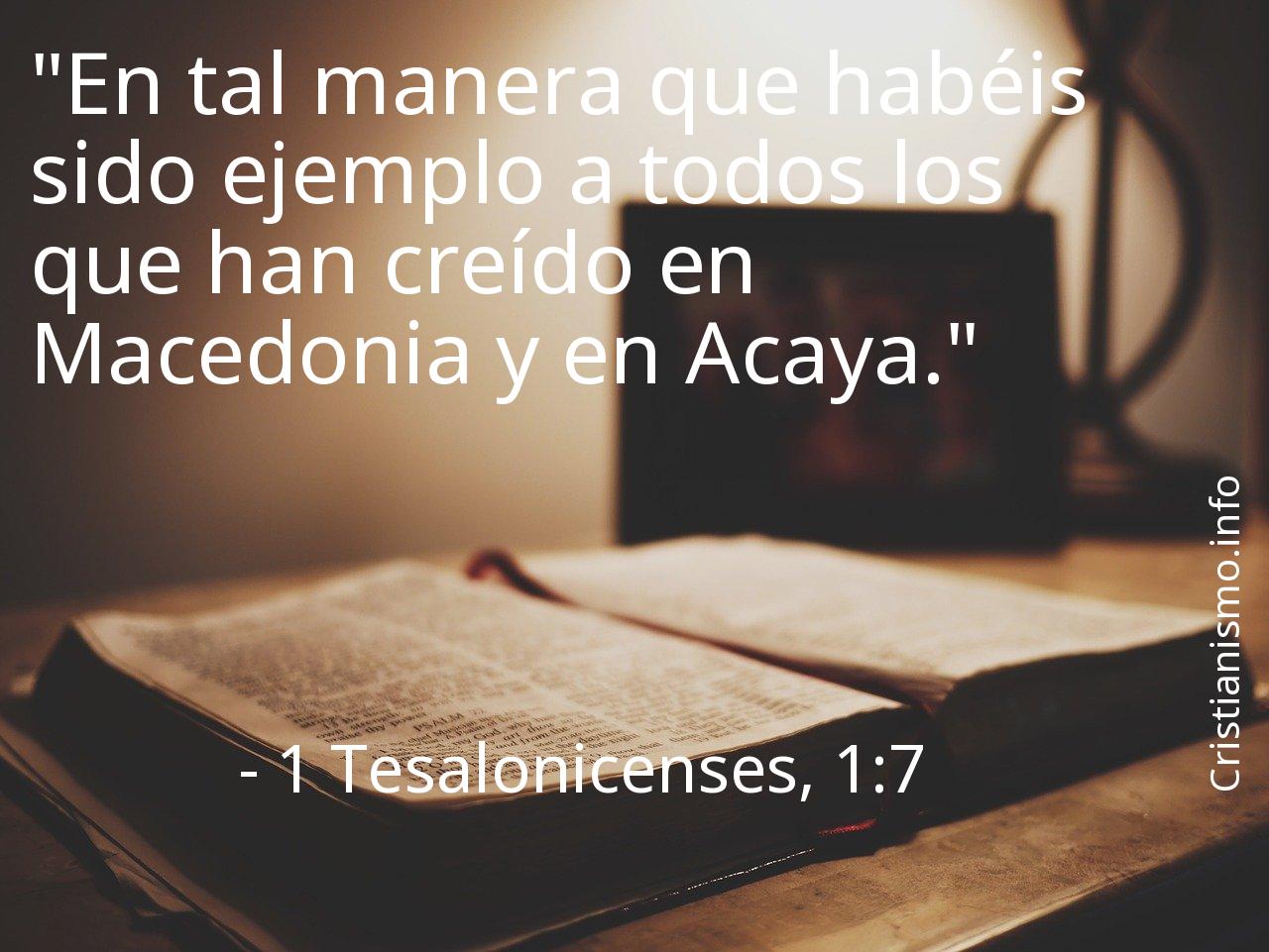 Es conveniente tomar continuamente en consideración el versículo 1 Tesalonicenses, 1:7 de La Santa Biblia a fin de reflexionar sobre él.Quizás sería acertado cuestionarse ¿Qué pretendía proponernos el Señor con el versículo 1 Tesalonicenses, 1:7? ¿Cuáles serán las coyunturas de nuestra vida cotidiana en que podemos llevar a la práctica lo que hemos alcanzado a saber gracias al versículo 1 Tesalonicenses, 1:7 de Las Sagradas Escrituras?