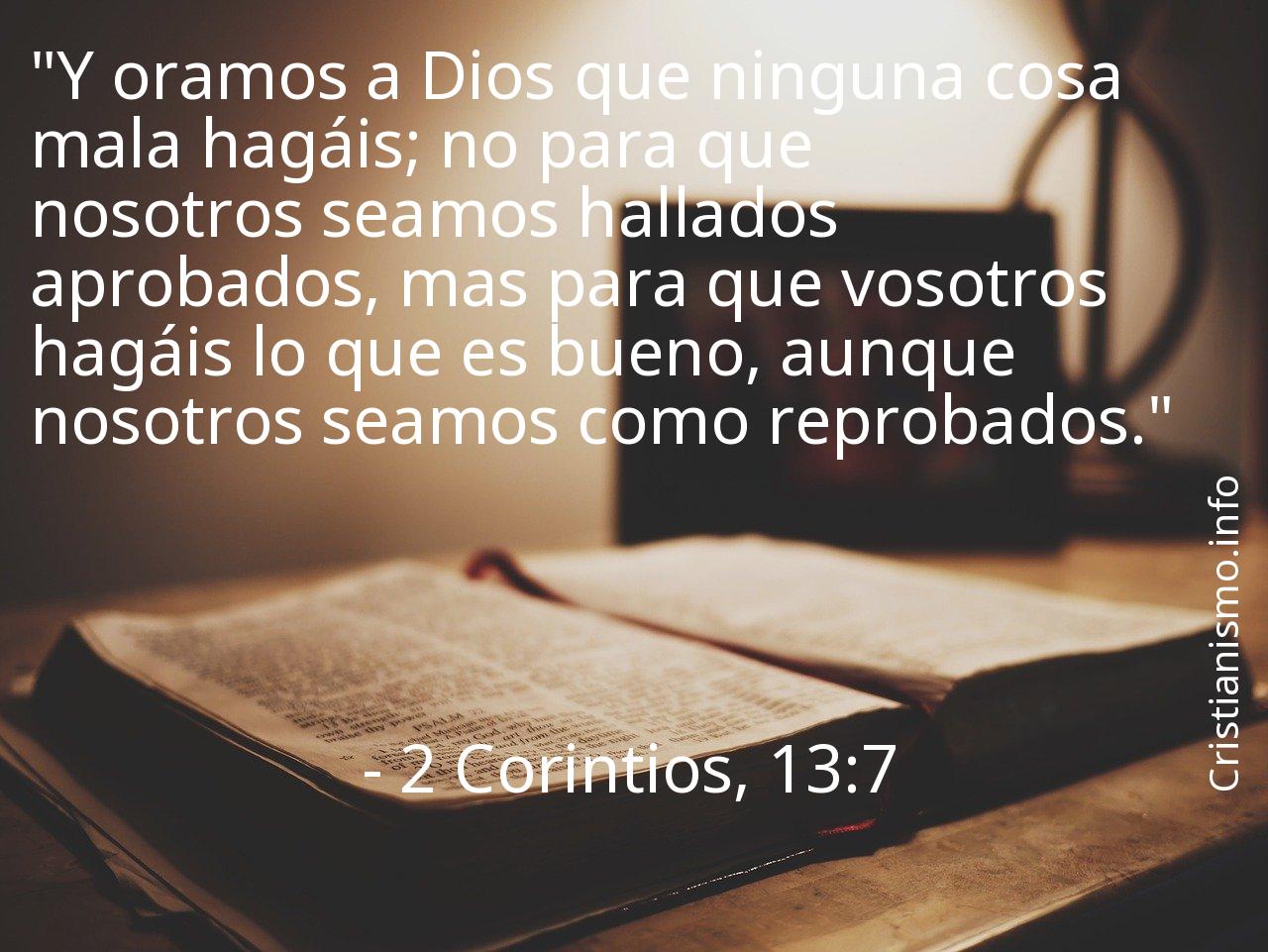 Meditar acerca de el versículo 2 Corintios, 13:7 nos supone una ayuda a ser capaces de acercarnos más al mensaje de Nuestro Señor y a aproximarnos más a Dios, por esa razón es útil apoyarse en el versículo 2 Corintios, 13:7 cada vez que necesitemos palabras que nos inspiren y guíen y así saber cómo actuar o para traer la paz a nuestros corazones.