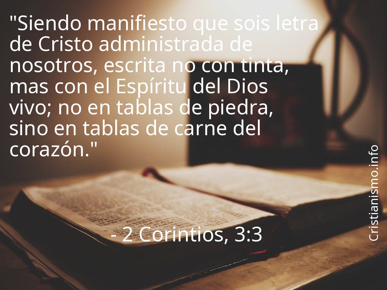 El versiculo 2 Corintios, 3:3 de los Textos Sagrados que componen la Biblia consiste en algo que es aconsejable tomar siempre en cuenta a fin de hacer una reflexión acerca de él.Tal vez sería bueno preguntarse ¿Qué trataba de decirnos el Señor con el versículo 2 Corintios, 3:3? ¿Cuáles son los momentos de nuestra vida diaria en que tenemos la oportunidad de hacer valer aquello que aprendemos gracias al versículo 2 Corintios, 3:3 de la Santa Biblia?