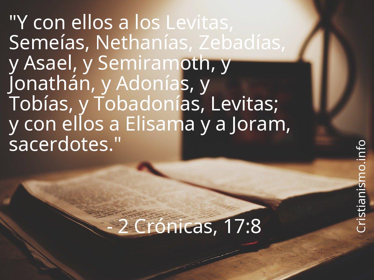Es muy recomendable tomar continuamente en cuenta el versículo 2 Crónicas, 17:8 de La Sagrada Biblia de manera que podamos hacer una reflexión acerca de él. Acaso deberíamos preguntarnos ¿Qué pretendía manifestarnos el Señor con el versículo 2 Crónicas, 17:8? ¿En qué momentos de nuestra vida cotidiana podemos aplicar aquello que aprendemos gracias al versículo 2 Crónicas, 17:8 de la Santa Biblia?