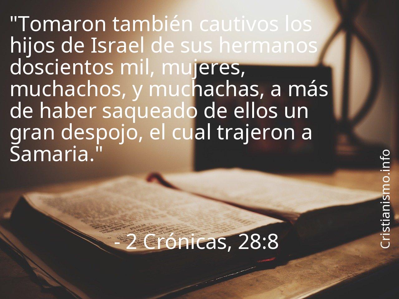 Nos conviene tomar continuamente en consideración el versículo 2 Crónicas, 28:8 de La Sagrada Biblia con la finalidad de analizarlo y pensar acerca de él. ¿Qué pretendía decirnos Nuestro Padre que está en los Cielos con el versículo 2 Crónicas, 28:8? ¿Cuáles son los momentos de nuestro día a día en que seremos capaces de aprovechar aquello que hemos llegado a saber gracias al versículo 2 Crónicas, 28:8 de La Sagrada Biblia?