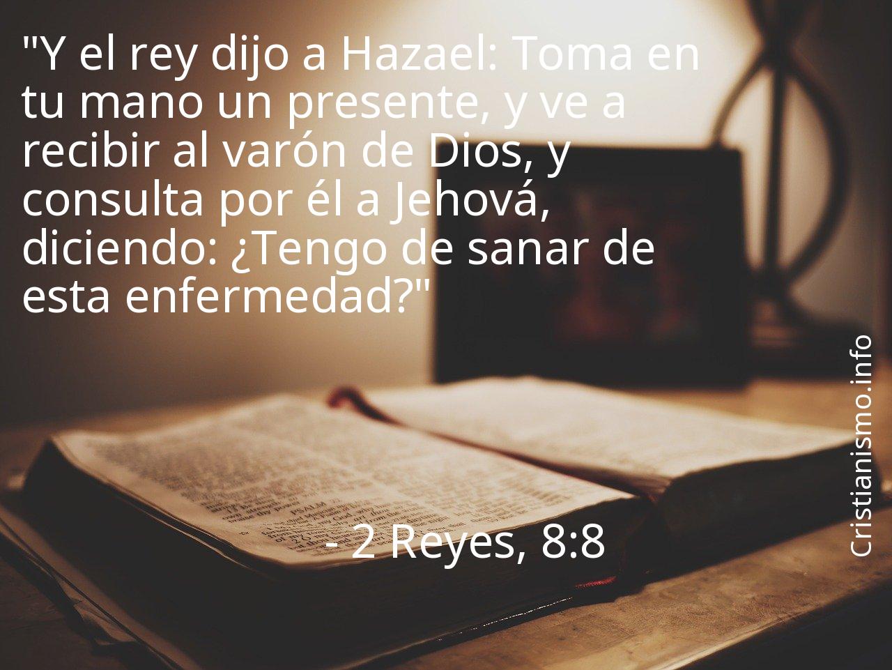 Discurrir y recapacitar acerca de el versículo 2 Reyes, 8:8 es un gran aporte que nos permite a ser mejores cristianos y a elevar nuestra alma hacia Dios, por ese motivo es bueno recurrir al versículo 2 Reyes, 8:8 en todas aquellas ocasiones en que necesitemos una luz que nos guíe de modo que podamos saber en qué forma acturar o para traer paz a nuestros corazones.