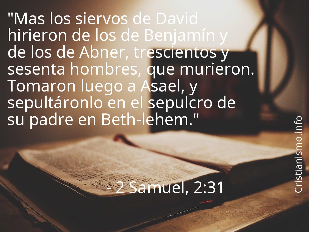 Meditar en relación con el versículo 2 Samuel, 2:31 nos supone una ayuda a ser mejores cristianos y a aproximarnos más a Dios, esa es la razón por la cual es bueno acudir al versículo 2 Samuel, 2:31 cuando creamos que necesitemos una luz que nos guíe y así saber qué pasos dar o para traer la tranquilidad a nuestros corazones y almas.