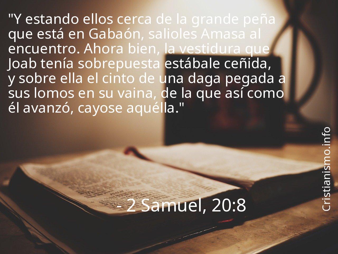 Meditar en relación con el versículo 2 Samuel, 20:8 nos supone una ayuda a ser mejores cristianos y a elevar nuestra alma hacia Dios, esa es la razón por la cual es bueno apoyarse en el versículo 2 Samuel, 20:8 siempre que pueda servirnos de guía y así saber cómo actuar o para traer la paz a nuestras almas.