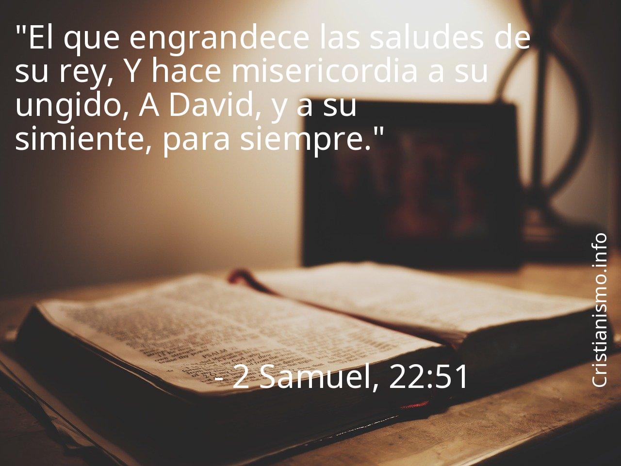 El hecho de reflexionar acerca de el versículo 2 Samuel, 22:51 es un gran aporte que nos permite a ser capaces de acercarnos más al mensaje de Nuestro Señor y a acercarnos más a Dios, por esa razón es bueno recurrir al versículo 2 Samuel, 22:51 todas las veces que necesitemos una luz que nos guíe y así saber en qué forma acturar o para traer la tranquilidad a nuestras almas.