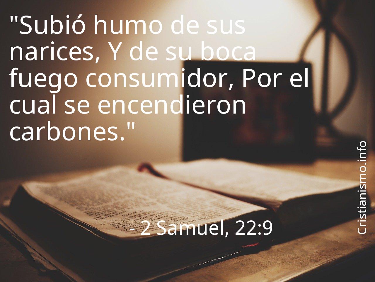 Meditar acerca de el versículo 2 Samuel, 22:9 nos supone una ayuda a ser más agradables a los ojos de el Creador del Cielo y de la Tierra y a elevar nuestra alma hacia Dios, por ese motivo es conveniente recurrir al versículo 2 Samuel, 22:9 en todas aquellas ocasiones en que necesitemos una luz que nos guíe y así saber qué pasos dar o para traer paz a nuestros corazones.