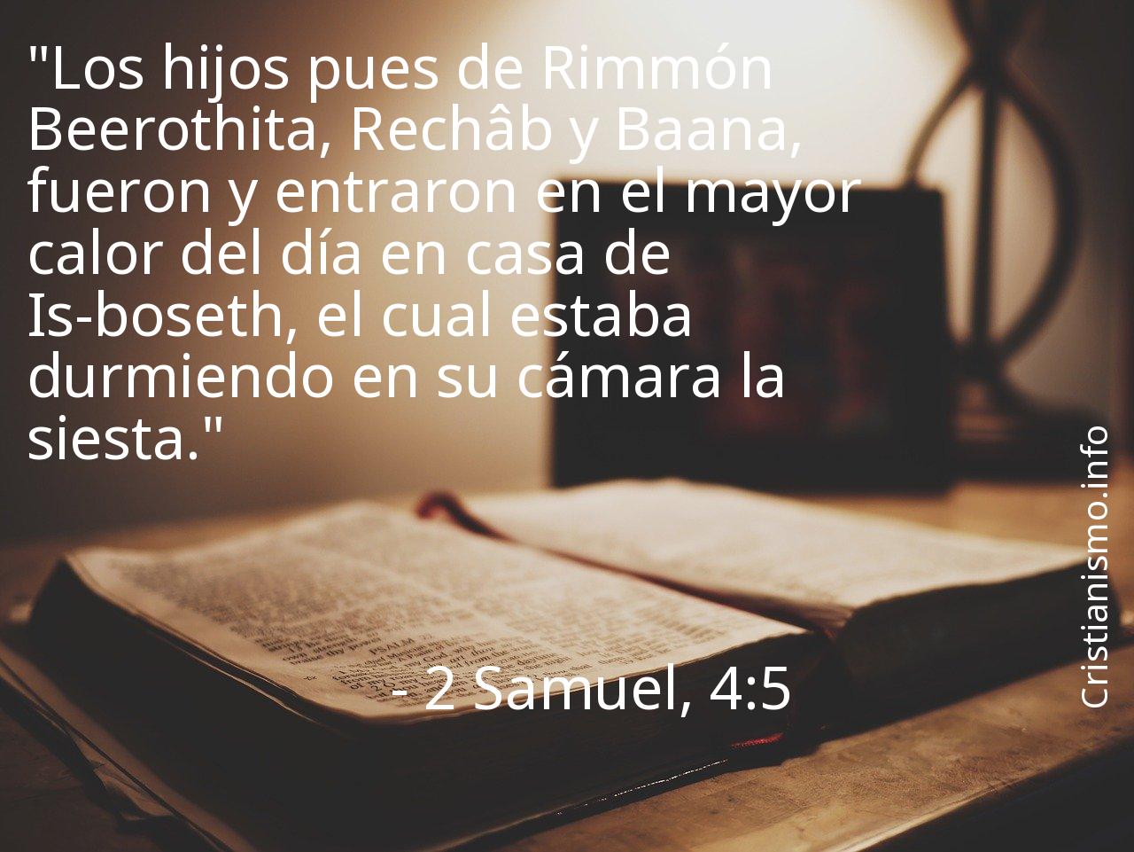 Meditar acerca de el versículo 2 Samuel, 4:5 nos supone una ayuda a ser mejores personas y a elevar nuestra alma hacia Dios, por esa razón es bueno acudir al versículo 2 Samuel, 4:5 en todas aquellas ocasiones en que nos pueda servir de guía para saber cómo actuar o para traer el sosiego a nuestros corazones y almas.