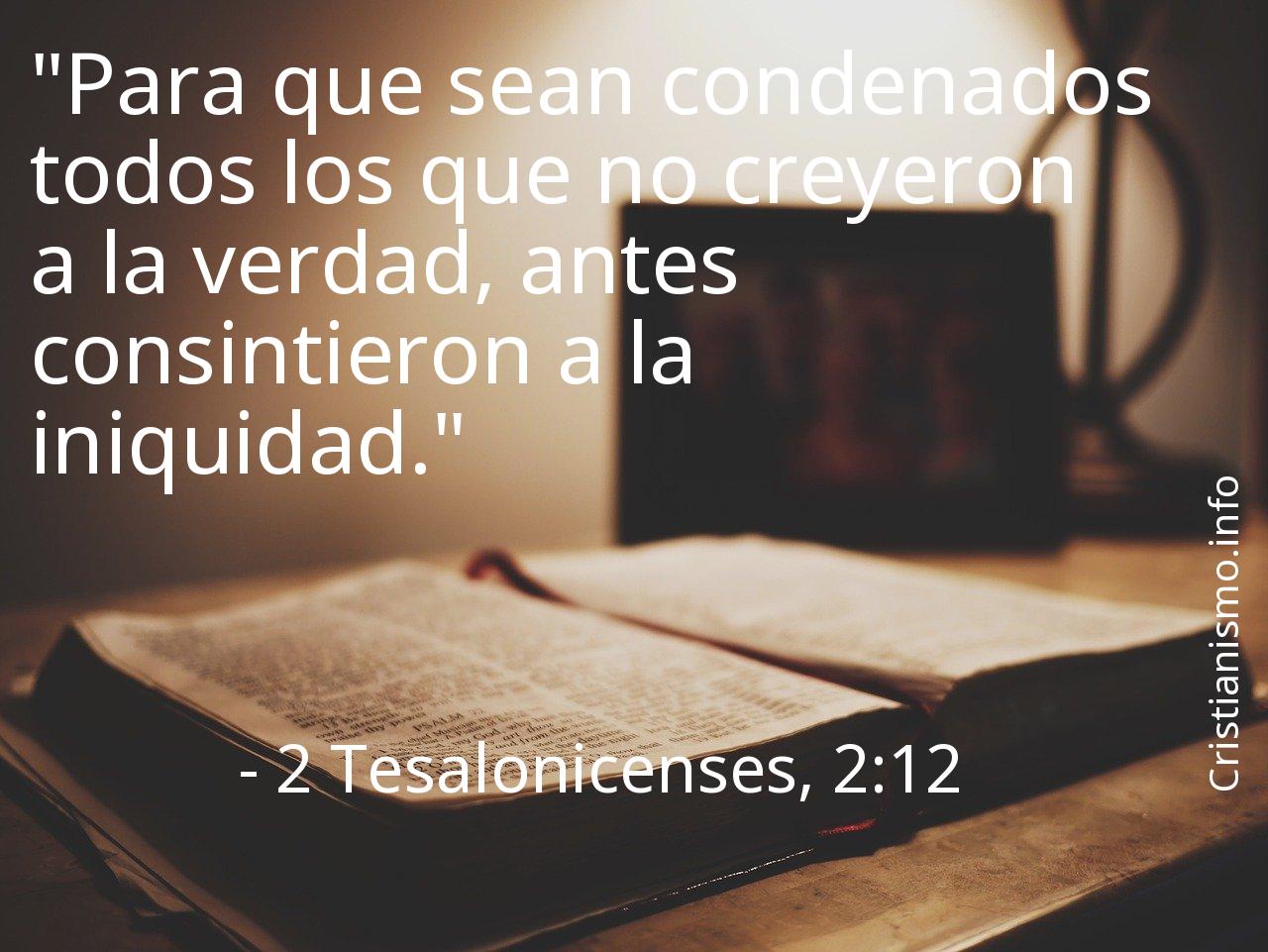 Nos conviene tener siempre presente el versículo 2 Tesalonicenses, 2:12 de los Textos Sagrados que componen la Biblia para reflexionar acerca de él. ¿Qué intentaba decirnos Dios Nuestro Señor con el versículo 2 Tesalonicenses, 2:12? ¿Cuáles serán las coyunturas de nuestro día a día en que podemos recurrir a lo que hemos aprendido gracias al versículo 2 Tesalonicenses, 2:12 de Las Sagradas Escrituras?