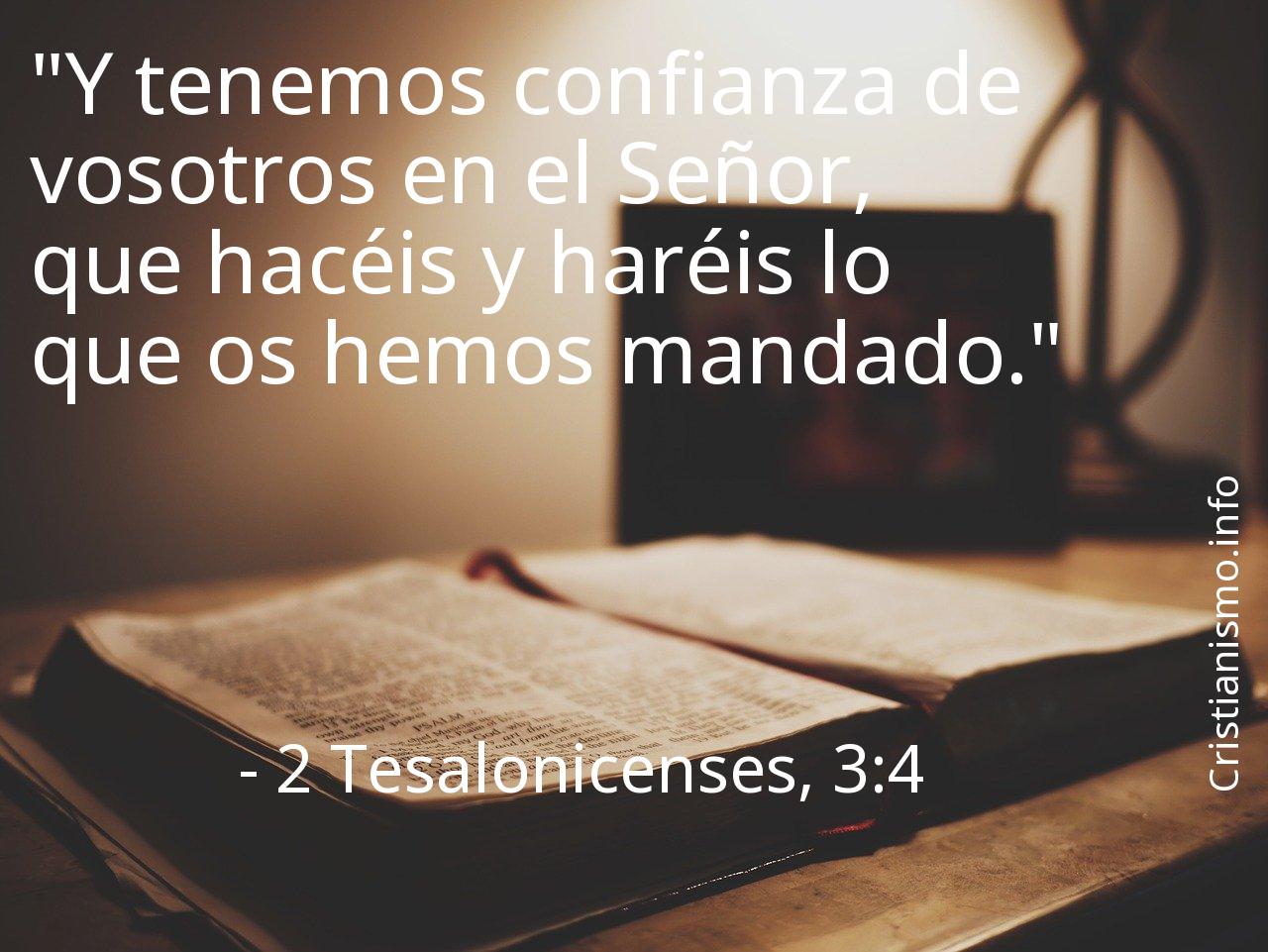 El versiculo 2 Tesalonicenses, 3:4 de La Sagrada Biblia es algo que debemos tomar continuamente en cuenta de manera que podamos analizarlo y pensar sobre él.Probablemente deberíamos preguntarnos ¿Qué intentaba decirnos Nuestro Padre Todopoderoso con el versículo 2 Tesalonicenses, 3:4? ¿Cuáles son los momentos de nuestra vida diaria en que tenemos la oportunidad de hacer valer aquello que hemos llegado a saber gracias al versículo 2 Tesalonicenses, 3:4 de Las Sagradas Escrituras?