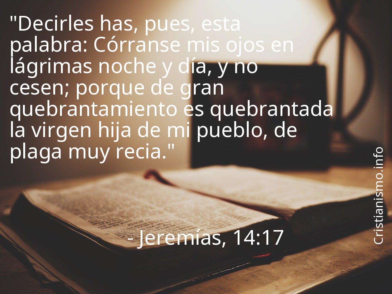 Es conveniente tomar siempre en consideración el versículo Jeremías, 14:17 de La Biblia con la finalidad de hacer una reflexión sobre él. Acaso deberíamos hacernos la pregunta ¿Qué quiso proponernos Nuestro Padre que está en los Cielos con el versículo Jeremías, 14:17? ¿Cuáles son las ocasiones de nuestra vida cotidiana en que tenemos la oportunidad de hacer valer aquello que aprendemos gracias al versículo Jeremías, 14:17 de la Santa Biblia?