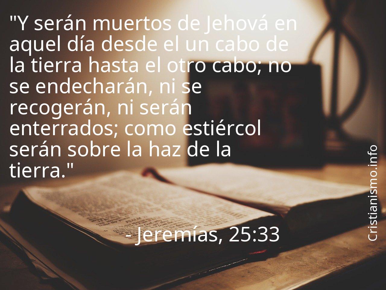 Es muy recomendable tener continuamente presente el versículo Jeremías, 25:33 de La Santa Biblia con el objetivo de analizarlo y pensar acerca de él.Probablemente sería adecuado preguntarse ¿Qué trataba de manifestarnos Dios, Creador del Cielo y de la Tierra con el versículo Jeremías, 25:33? ¿En qué coyunturas de nuestra vida diaria podemos hacer valer lo que hemos alcanzado a saber gracias al versículo Jeremías, 25:33 de la Santa Biblia?