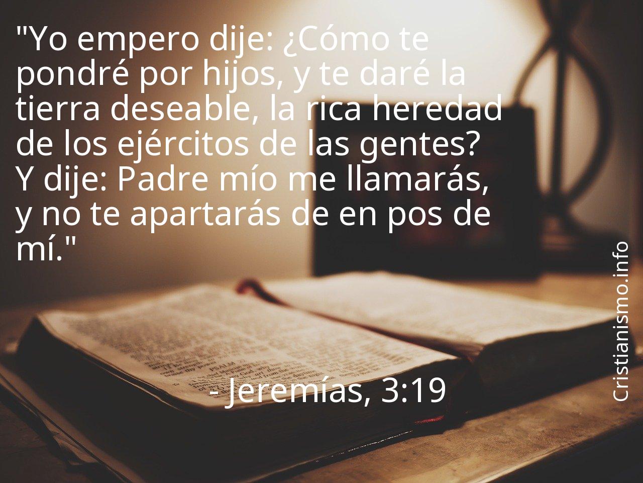 El versiculo Jeremías, 3:19 de La Biblia es algo que debemos tener continuamente presente con la finalidad de reflexionar acerca de él.Quizás sería acertado cuestionarse ¿Qué trataba de decirnos Dios, Creador del Cielo y de la Tierra con el versículo Jeremías, 3:19? ¿Cuáles serán las coyunturas de nuestra vida diaria en que seremos capaces de poner en práctica lo que aprendemos gracias al versículo Jeremías, 3:19 de la Santa Biblia?