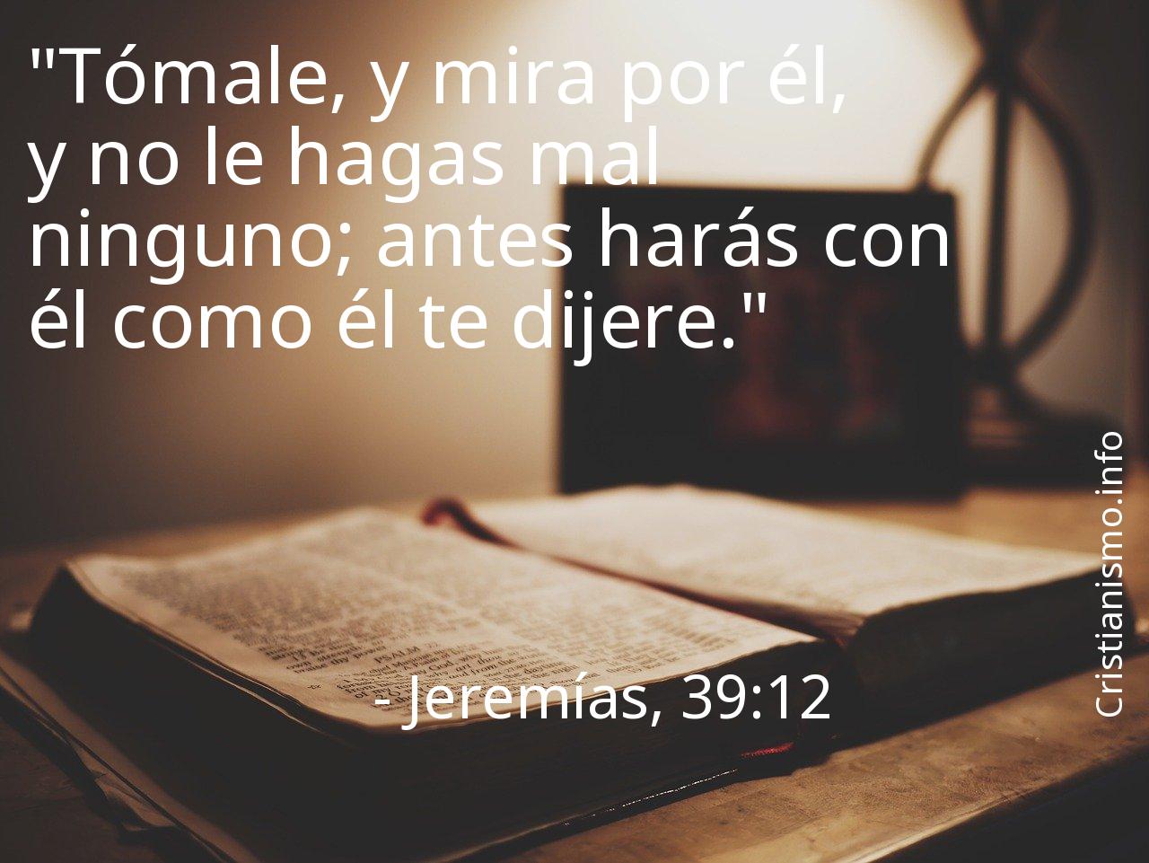 Meditar en relación con el versículo Jeremías, 39:12 nos supone una ayuda a ser más agradables a los ojos de el Creador del Cielo y de la Tierra y a elevar nuestra alma hacia Dios, esa es la cuestión por la cual es conveniente recurrir al versículo Jeremías, 39:12 todas las veces que nos pueda servir de guía para saber qué pasos dar o para traer la paz a nuestras almas.