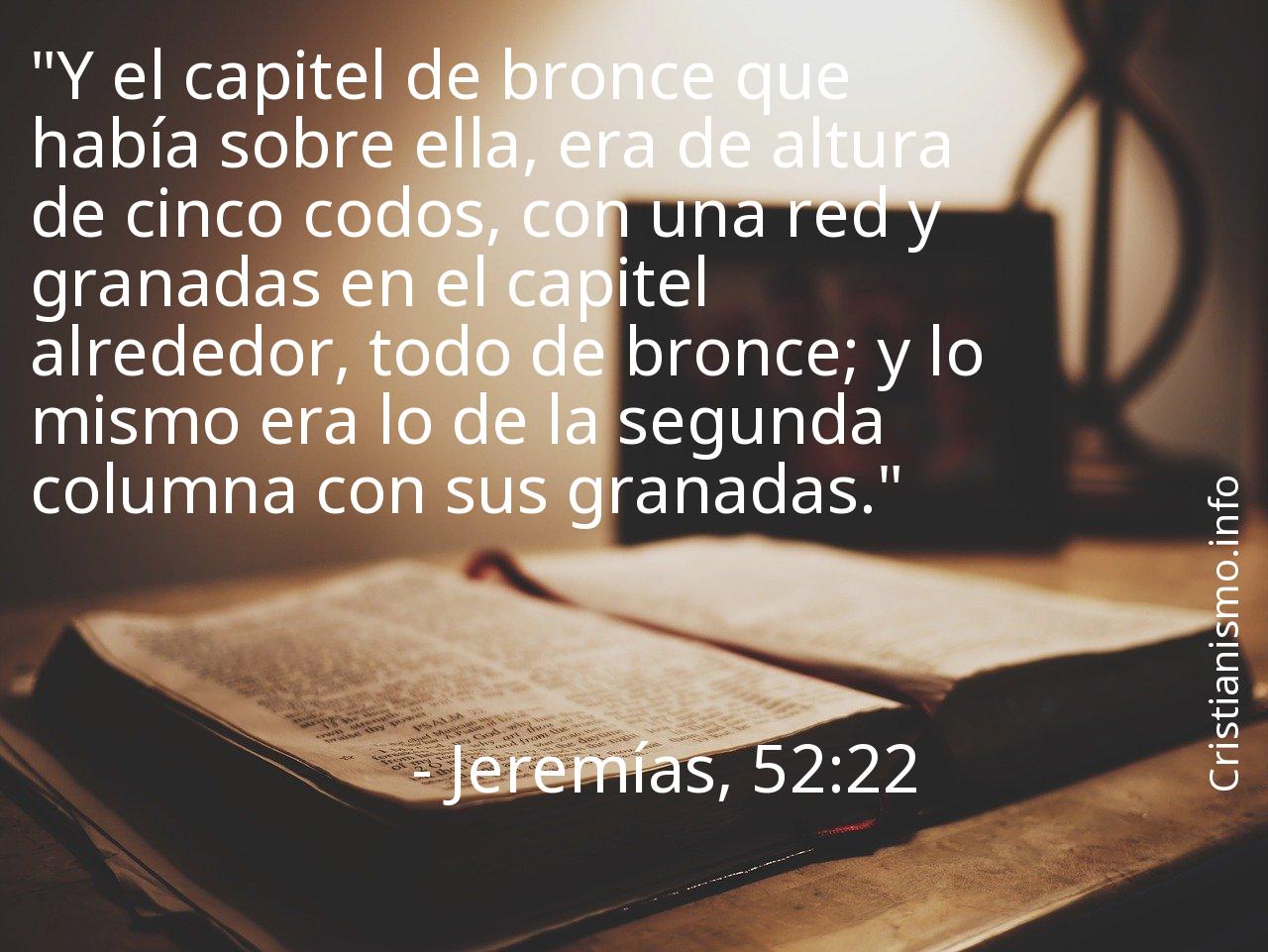 Meditar acerca de el versículo Jeremías, 52:22 nos es de gran ayuda a ser capaces de acercarnos más al mensaje de Nuestro Señor y a avanzar en nuestro camino hacia la Gracia de Dios, por esa cuestión es útil apoyarse en el versículo Jeremías, 52:22 en todas aquellas ocasiones en que precisemos que la palabra de Dios, Nuestro Señor nos indique el camino a seguir de modo que podamos saber cómo actuar o para traer paz a nuestro espíritu.