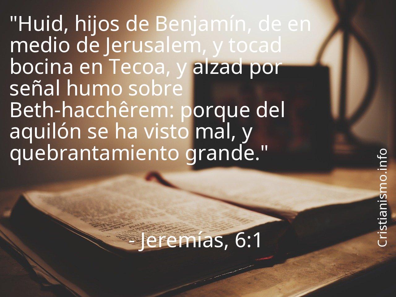 Es muy recomendable tomar siempre en cuenta el versículo Jeremías, 6:1 de La Biblia con el fin de reflexionar en torno a él. ¿Qué quiso manifestarnos Nuestro Padre que está en los Cielos con el versículo Jeremías, 6:1? ¿En qué ocasiones de nuestro día a día tenemos la oportunidad de hacer valer lo que hemos alcanzado a saber gracias al versículo Jeremías, 6:1 de La Biblia?