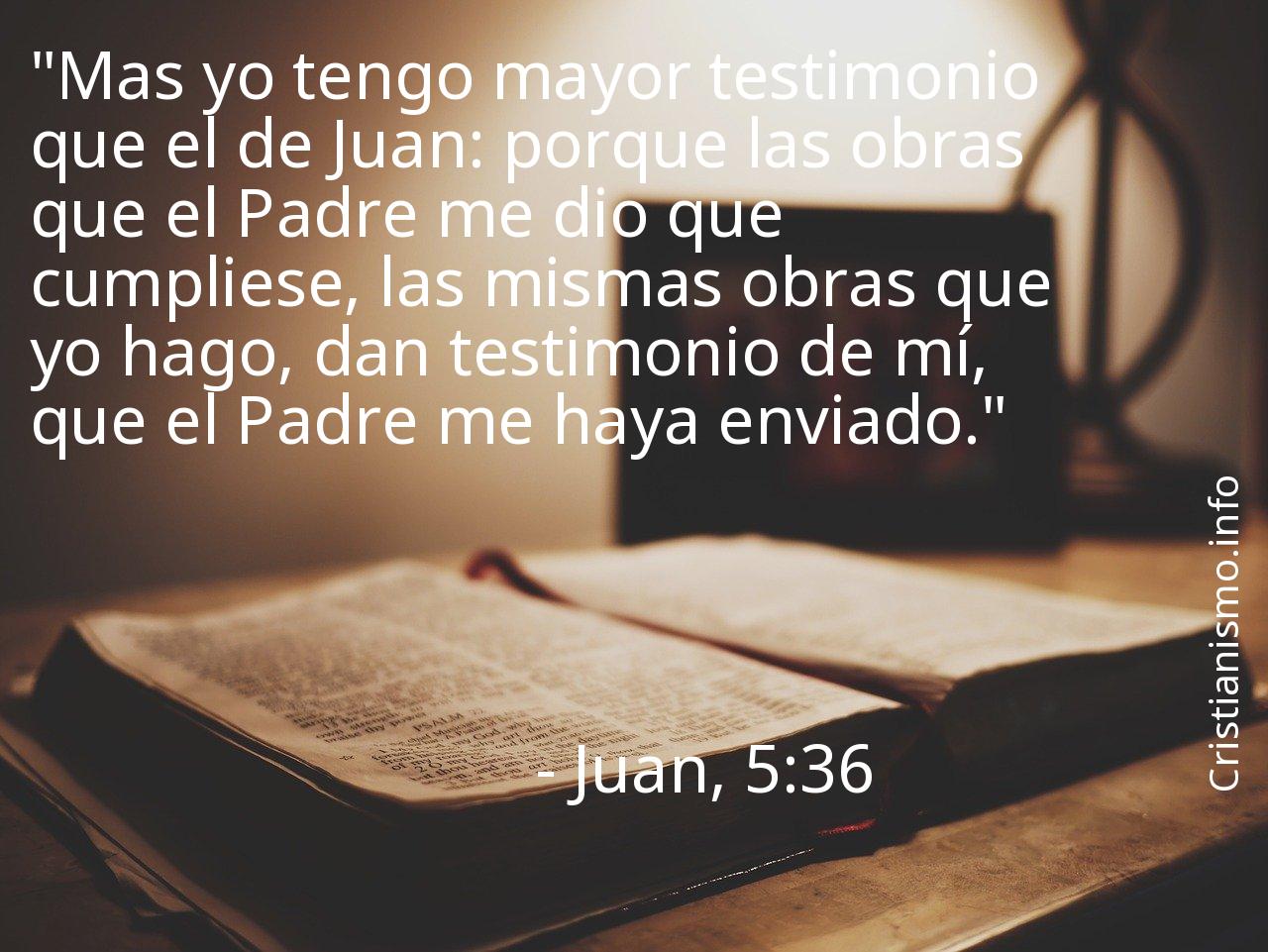 El versiculo Juan, 5:36 de La Biblia es algo que es aconsejable tomar continuamente en cuenta a fin de meditar acerca de él.Probablemente deberíamos preguntarnos ¿Qué pretendía decirnos Nuestro Padre Todopoderoso con el versículo Juan, 5:36? ¿Cuáles son los momentos de nuestro día a día en que seremos capaces de hacer valer lo que hemos alcanzado a saber gracias al versículo Juan, 5:36 de Las Sagradas Escrituras?