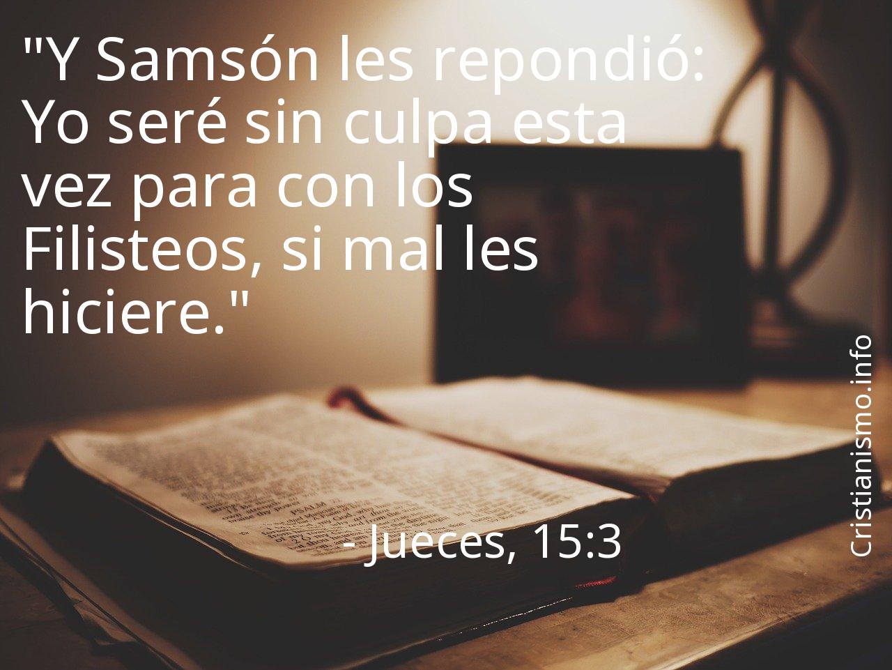 Meditar acerca de el versículo Jueces, 15:3 nos supone una ayuda a ser más agradables a los ojos de el Creador del Cielo y de la Tierra y a elevar nuestra alma hacia Dios, esa es la razón por la cual es bueno recurrir al versículo Jueces, 15:3 en todas aquellas ocasiones en que precisemos que la palabra de Dios, Nuestro Señor nos indique el camino a seguir y así saber cómo actuar o para traer el sosiego a nuestras almas.