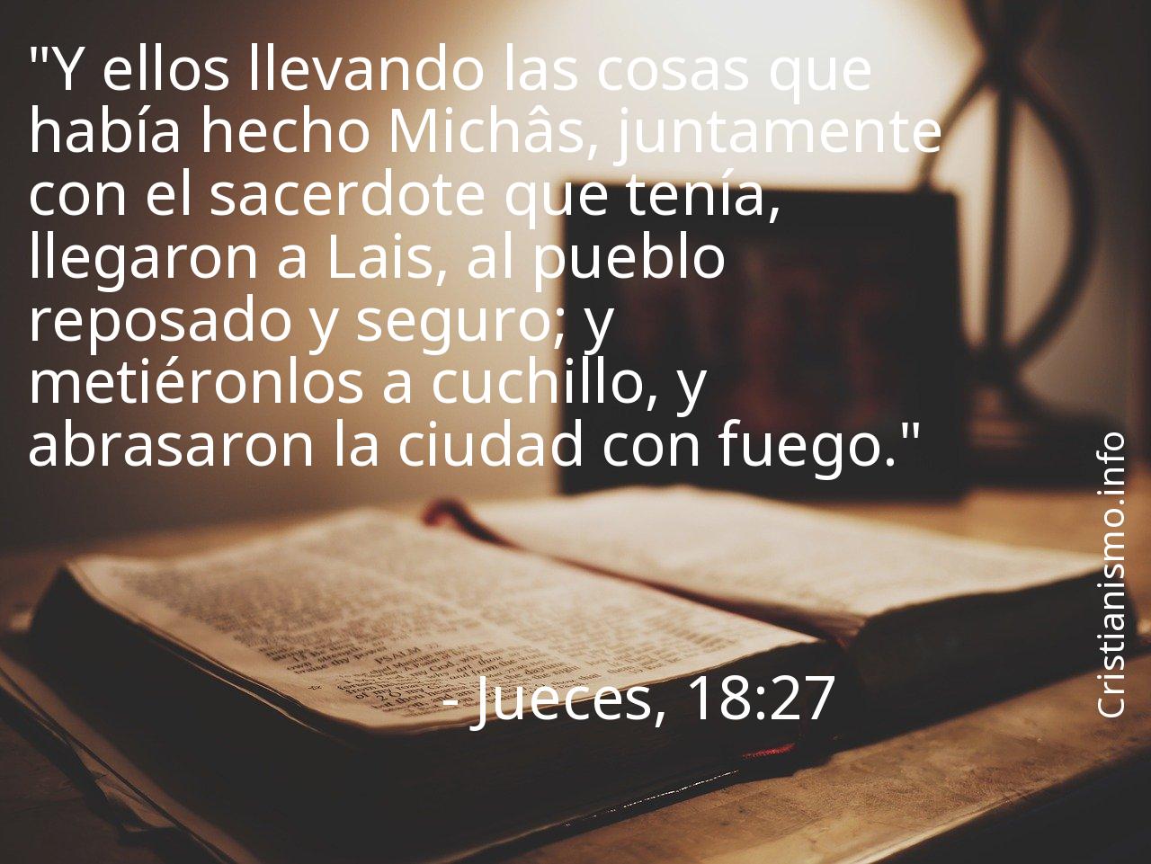Meditar en torno a lo que se refiere el versículo Jueces, 18:27 nos supone una ayuda a ser mejores cristianos y a acercarnos más a Dios, por eso es oportuno recurrir al versículo Jueces, 18:27 siempre que pueda servirnos de guía para saber qué pasos dar o para traer la paz a nuestras almas.