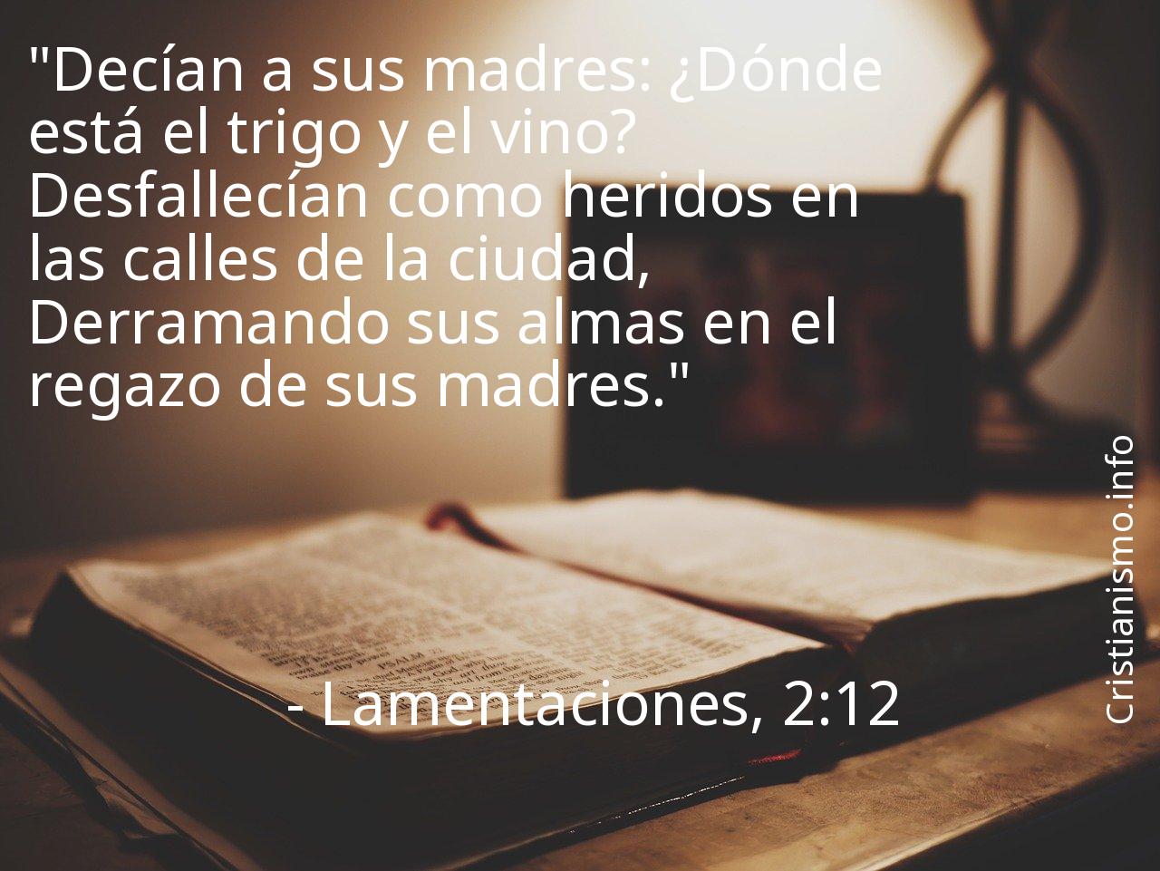 Nos conviene tomar siempre en consideración el versículo Lamentaciones, 2:12 de La Sagrada Biblia para reflexionar en torno a él.Tal vez deberíamos preguntarnos ¿Qué quiso manifestarnos Dios con el versículo Lamentaciones, 2:12? ¿Cuáles son los momentos de nuestra vida diaria en que seremos capaces de poner en práctica lo que hemos alcanzado a saber gracias al versículo Lamentaciones, 2:12 de la Santa Biblia?