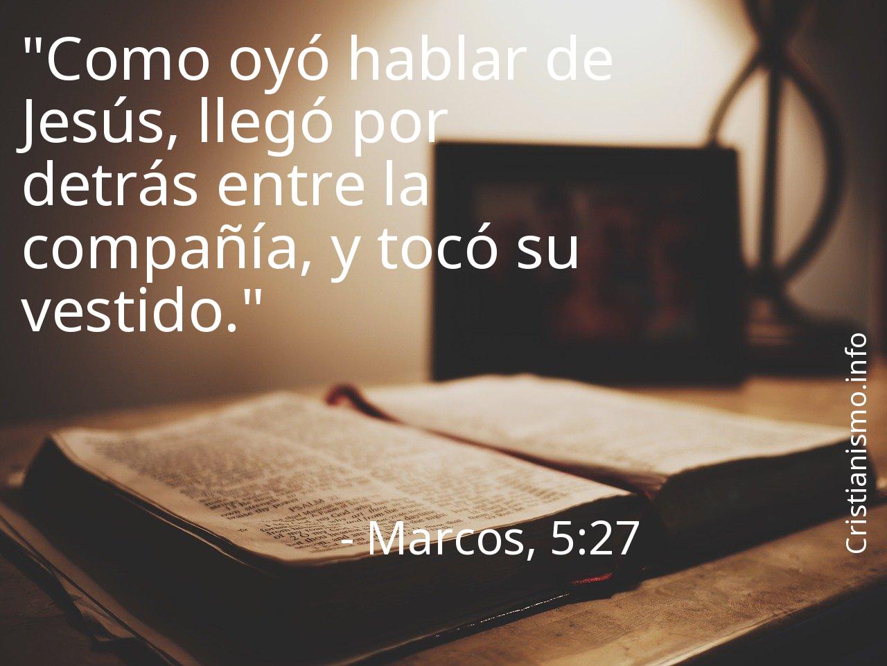 Dedicar tiempo a la meditación acerca de el versículo Marcos, 5:27 nos es de gran ayuda a ser más agradables a los ojos de el Creador del Cielo y de la Tierra y a acercarnos más a Dios, ese es el motivo por el cual es útil apoyarse en el versículo Marcos, 5:27 todas las veces que precisemos que la palabra de Dios, Nuestro Señor nos indique el camino a seguir y así saber en qué forma acturar o para traer la paz a nuestros corazones y almas.