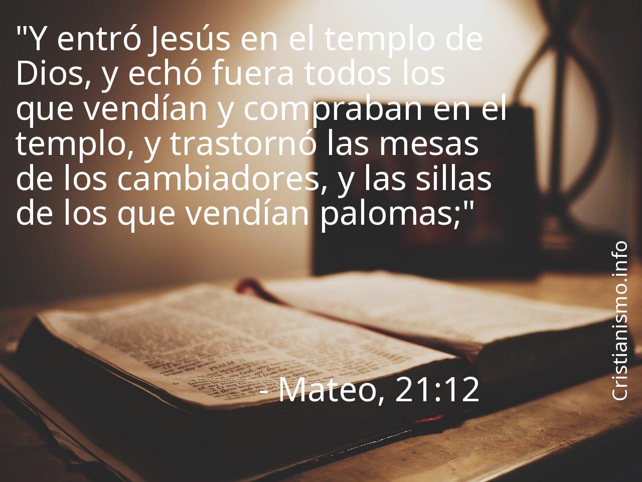 El versiculo Mateo, 21:12 de los Textos Sagrados que componen la Biblia es algo que hay que tener en todo momento presente de tal forma que podamos reflexionar en torno a él. Acaso deberíamos hacernos la pregunta ¿Qué quiso proponernos Nuestro Padre Todopoderoso con el versículo Mateo, 21:12? ¿En qué momentos de nuestra vida diaria podemos poner en práctica aquello que hemos aprendido gracias al versículo Mateo, 21:12 de La Biblia?