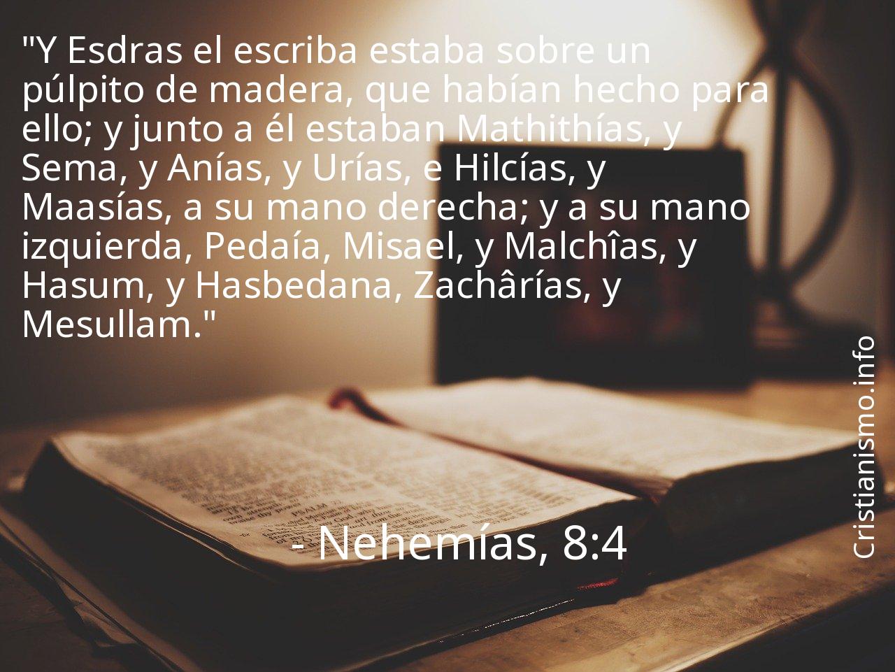 El hecho de reflexionar sobre el versículo Nehemías, 8:4 nos supone una ayuda a ser capaces de acercarnos más al mensaje de Nuestro Señor y a acercarnos más a Dios, ese es el motivo por el cual es conveniente acudir al versículo Nehemías, 8:4 cada vez que pueda servirnos de guía de modo que podamos saber qué pasos dar o para traer la tranquilidad a nuestros corazones y almas.