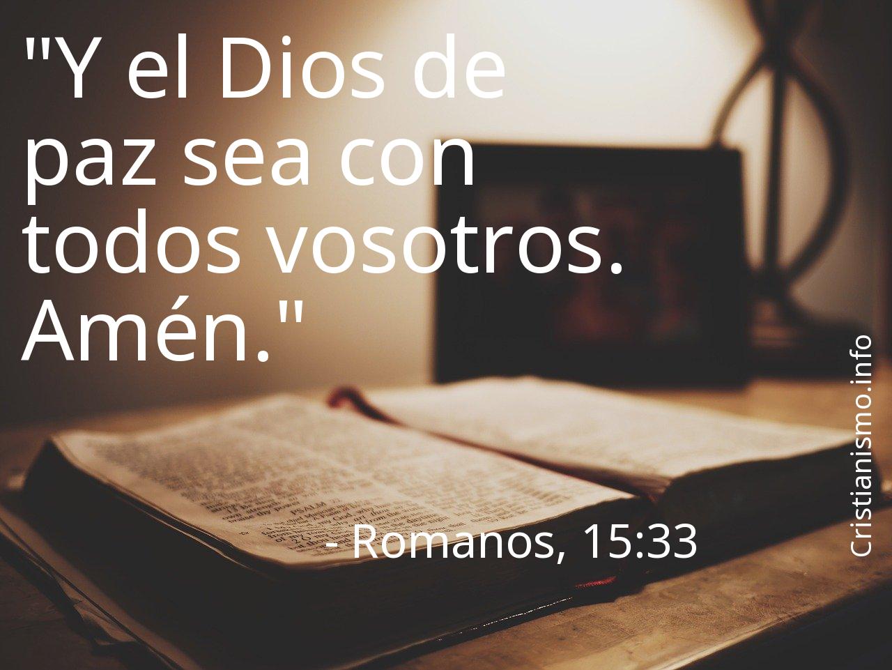 El versiculo Romanos, 15:33 de los Textos Sagrados que componen la Biblia consiste en algo que es aconsejable tener en todo momento presente a fin de analizarlo y pensar acerca de él.Quizás deberíamos hacernos la pregunta ¿Qué pretendía proponernos Nuestro Padre que está en los Cielos con el versículo Romanos, 15:33? ¿En qué ocasiones de nuestro día a día tenemos la oportunidad de hacer valer lo que hemos aprendido gracias al versículo Romanos, 15:33 de la Santa Biblia?