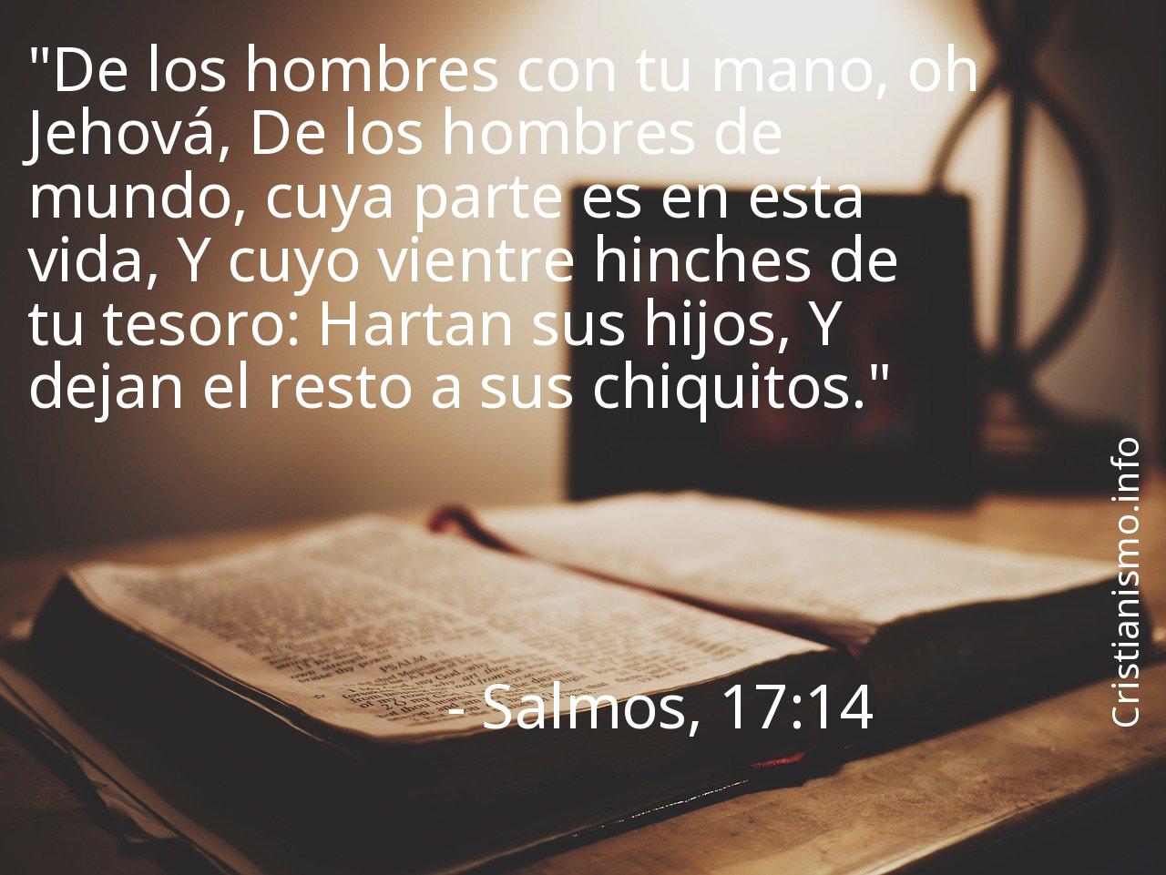 El hecho de reflexionar acerca de el versículo Salmos, 17:14 nos ayuda a ser capaces de acercarnos más al mensaje de Nuestro Señor y a aproximarnos más a Dios, esa es la cuestión por la cual es oportuno apoyarse en el versículo Salmos, 17:14 siempre que precisemos que la palabra de Dios, Nuestro Señor nos indique el camino a seguir de modo que podamos saber cómo actuar o para traer la serenidad a nuestros corazones y almas.