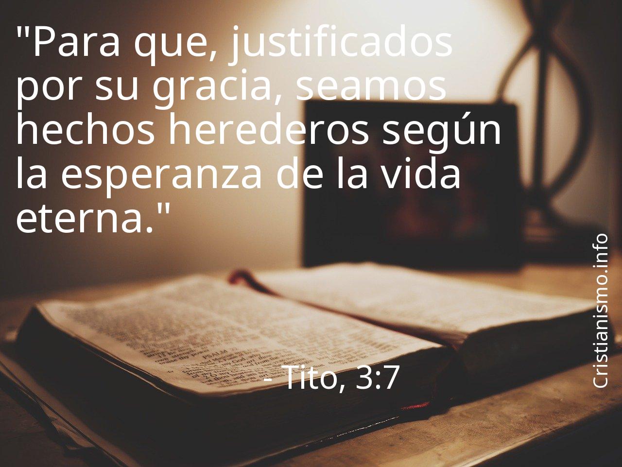 Es aconsejable tener siempre presente el versículo Tito, 3:7 de La Sagrada Biblia con el propósito de analizarlo y pensar sobre él. ¿Qué quiso manifestarnos Nuestro Padre que está en los Cielos con el versículo Tito, 3:7? ¿En qué ocasiones de nuestra vida cotidiana podemos aprovechar aquello que hemos llegado a saber gracias al versículo Tito, 3:7 de Las Sagradas Escrituras?